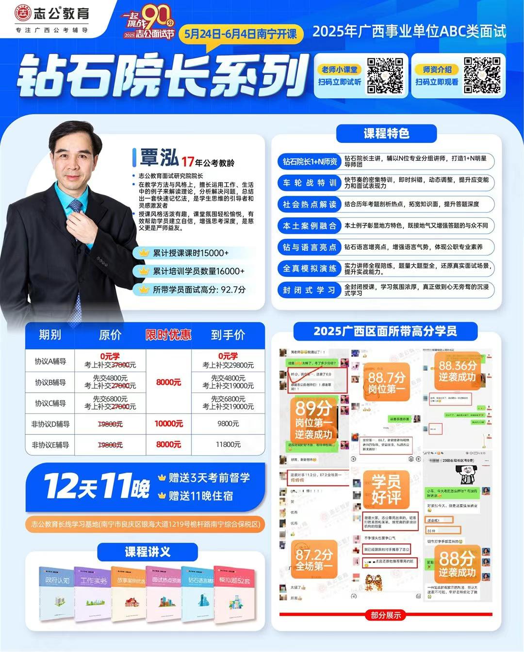 志公教育2025廣西事業(yè)單位ABC類面試鉆石院長系列課程,以專業(yè)的師資、科學的課程體系和卓越的教學效果,助力考生備戰(zhàn)考試,共創(chuàng)高分奇跡,實現(xiàn)職業(yè)夢想!