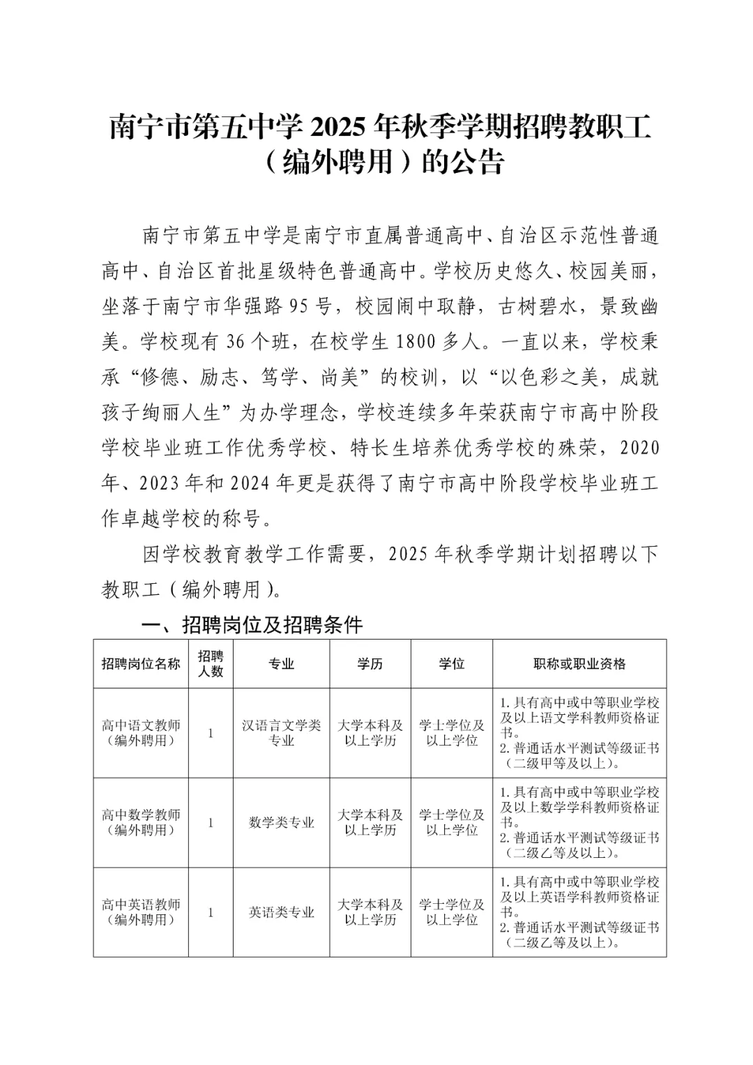 南寧市第五中學(xué)2025年秋季學(xué)期招聘教職工(編外聘用)5人