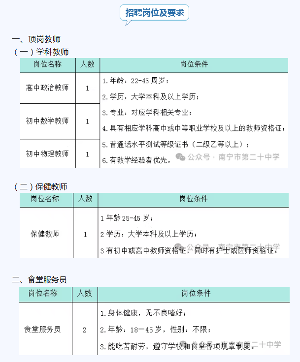 工資待遇:一旦聘用,雙方簽訂《勞動合同書》(食堂服務員試用期1個月,試用期滿經(jīng)考核合格后正式聘用),學校按規(guī)定發(fā)放工資及繳納“五險一金”。