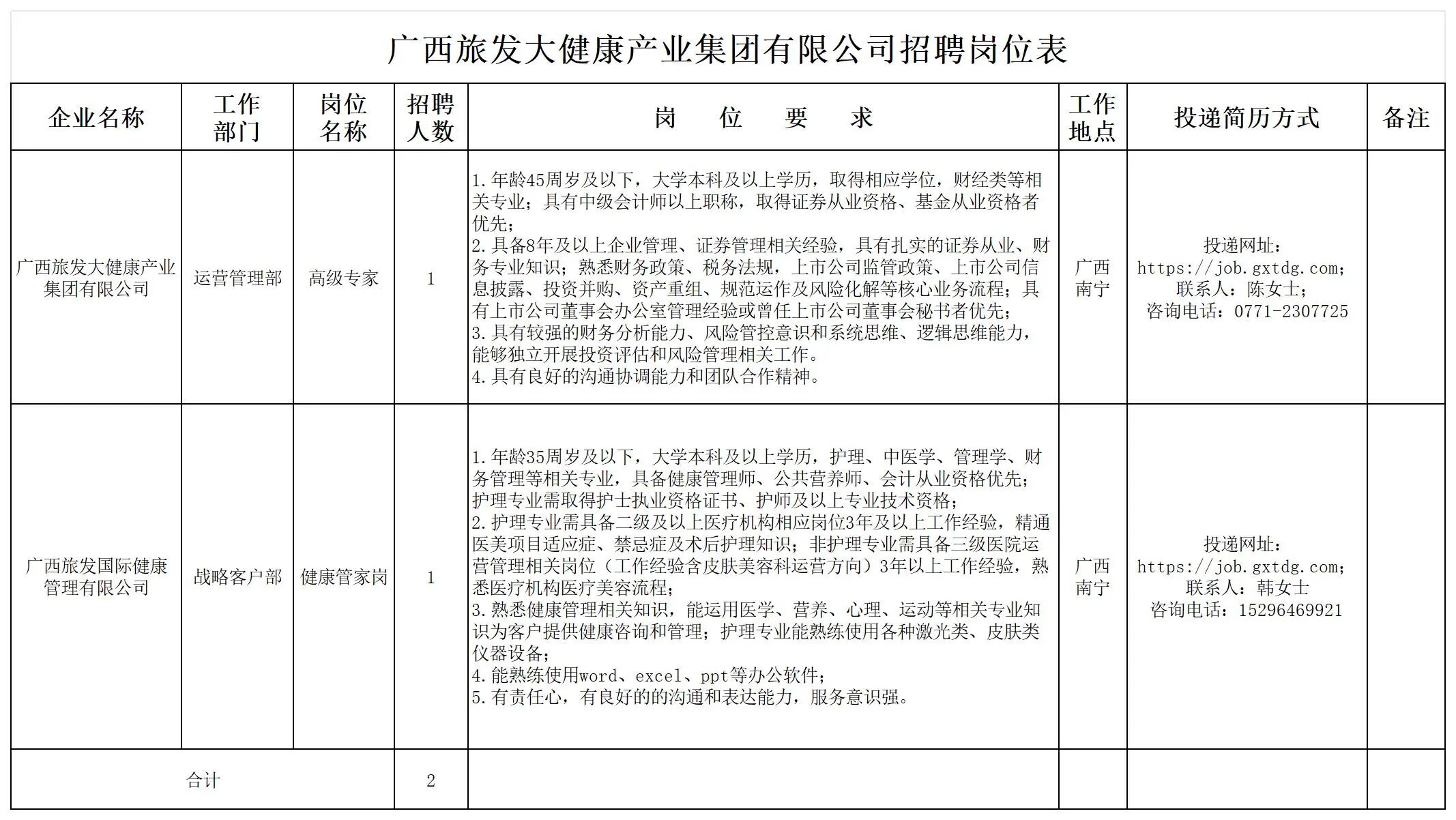 廣西旅發(fā)大健康產(chǎn)業(yè)集團有限公司有關崗位員工2名(詳見招聘崗位表)。
