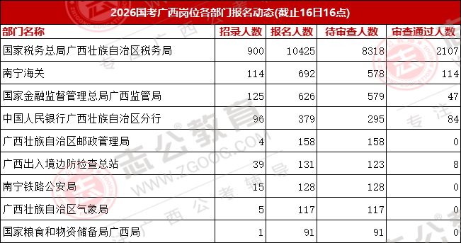 國考報(bào)名第二天,不少同學(xué)還處在觀望狀態(tài)。目前報(bào)名人數(shù)前三的部門依次為:國家稅務(wù)總局廣西壯族自治區(qū)稅務(wù)局,報(bào)名人數(shù)10425人;南寧海關(guān),報(bào)名人數(shù)692人;國家金融管理總局廣西監(jiān)管局,報(bào)名人數(shù)626人;這三個部門的報(bào)考總?cè)藬?shù)達(dá)11743人,報(bào)考熱度高度集中。